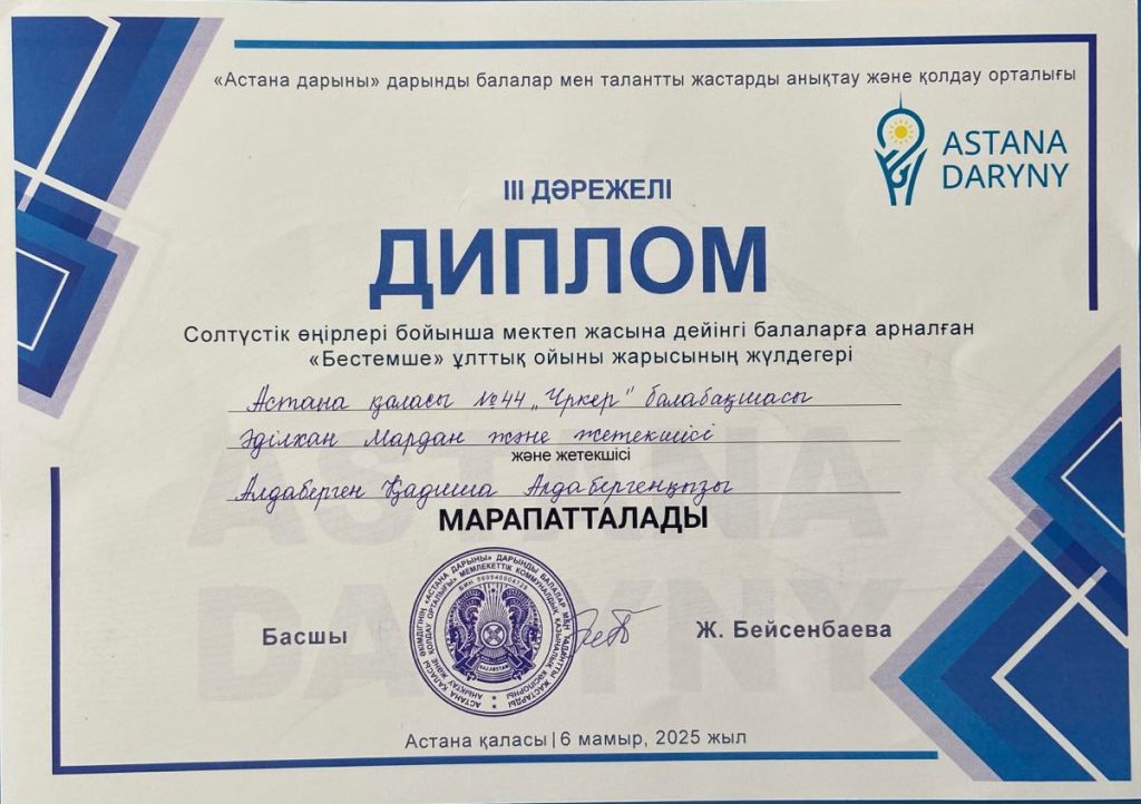 2025 жылы Астана қаласының Білім басқармасының қолдауымен және Астана қаласы әкімдігінің “Әдістемелік орталығы” мен әдіскерлер қауымдастығының ұйымдастыруымен мектепке дейінгі ұйымдарға арналған “Ертегілер елінде” байқауы өтті.